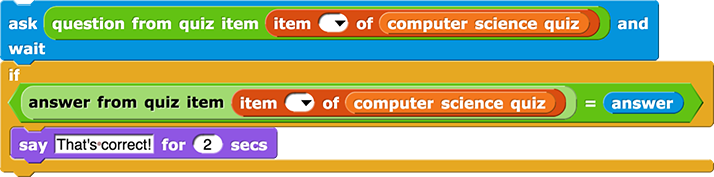 blocks are the selectors; they each select one piece of the data structure.quiz item abstract data type. An abstract data type (or ADT) is a custom data type that's meaningful to your program. It's not built into the language; you develop it as you code. This is an abstraction because it hides the details inside the constructor and selectors so that the programmer who uses a quiz item only has think about questions and answers and not about list indices.