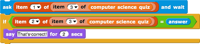But with nested lists (lists with sublists) it can be hard to keep track of the input numbers for item of, so a better way is to use abstraction to organize the quiz items.